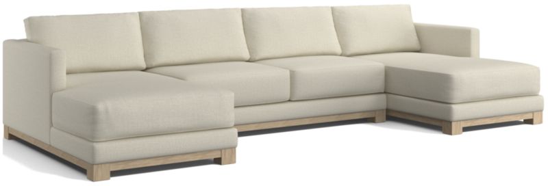 Striking the perfect balance between comfort and modern style, our Gather Petite sectional sofa is clean-lined, current and scaled to suit small spaces. Anchored by a natural wood base, each piece in the U-shaped sectional welcomes you with boxy, extra-plush seat cushions designed with inner-coil construction for maximum comfort and durability. Composed of right- and left-arm chaises and an armless sofa, the three-piece sectional features trim top-stitching to keep the look neat. The Gather Petite sectional sofa with wood base is a Crate & Barrel exclusive.