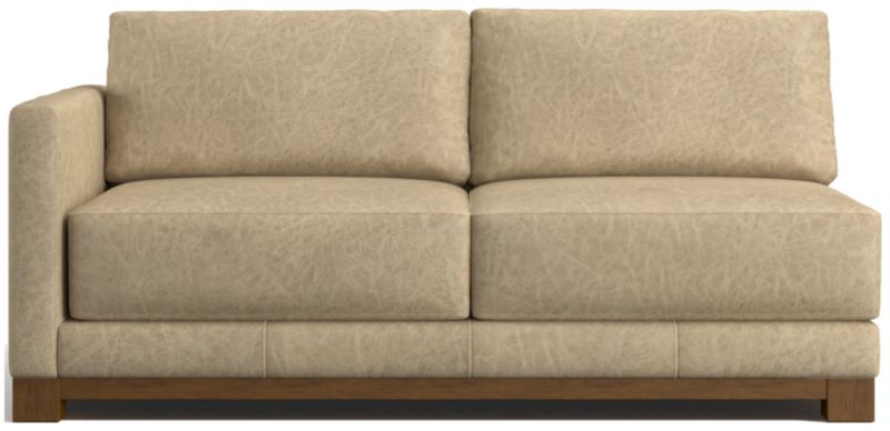 Striking the perfect balance between comfort and modern style, our Gather sectional seating is clean-lined, current and scaled to suit small spaces. Anchored by a natural wood base, the left-arm sofa welcomes you with boxy, extra-plush seat cushions designed with inner-coil construction for maximum comfort and durability. Trim top-stitching keeps the look neat, not fussy. Rich with natural markings and subtle color variations , the exquisite leather upholstery lends a dramatic look, supersmooth feel and high-sheen finish that makes Gather glow. The Gather left-arm sofa is a Crate & Barrel exclusive.By choosing FSC®-certified certified furniture, you are supporting responsible management of the world's forests.