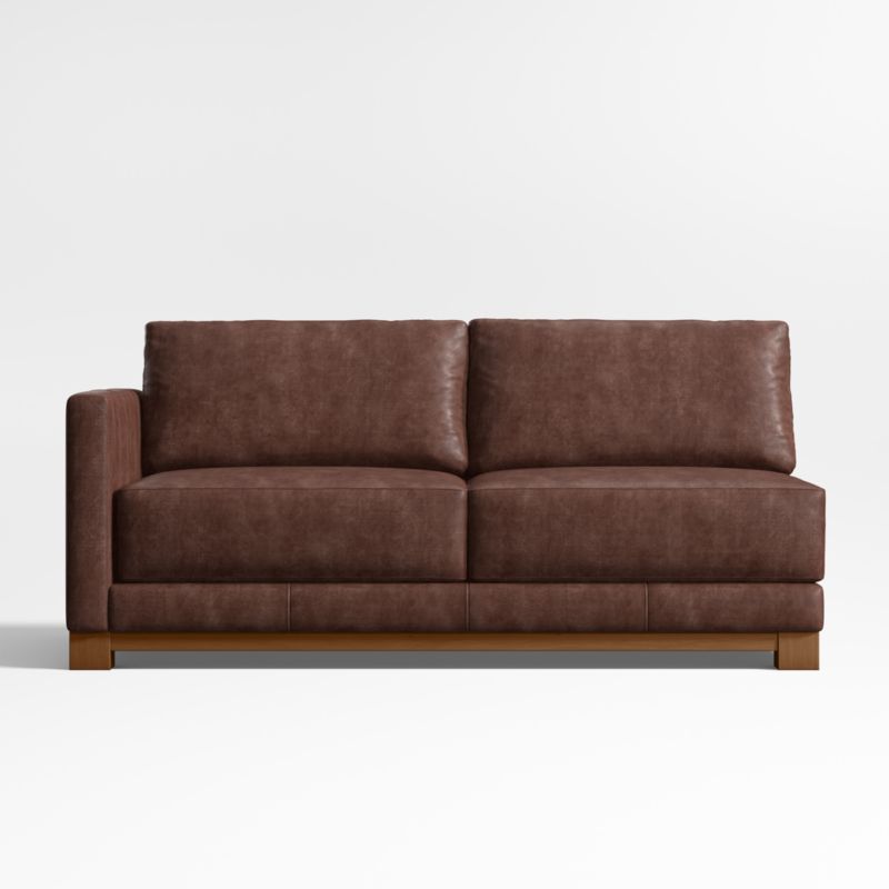 Striking the perfect balance between comfort and modern style, our Gather sectional seating is clean-lined, current and scaled to suit small spaces. Anchored by a natural wood base, the left-arm sofa welcomes you with boxy, extra-plush seat cushions designed with inner-coil construction for maximum comfort and durability. Trim top-stitching keeps the look neat, not fussy. Rich with natural markings and subtle color variations , the exquisite leather upholstery lends a dramatic look, supersmooth feel and high-sheen finish that makes Gather glow. The Gather left-arm sofa is a Crate & Barrel exclusive.By choosing FSC®-certified certified furniture, you are supporting responsible management of the world's forests.