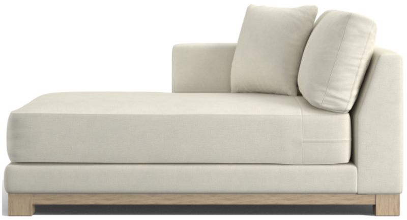 Striking the perfect balance between comfort and modern style, our Gather sectional seating is clean-lined, current and scaled to suit small spaces. Anchored by a natural wood base, the left-arm chaise welcomes you with a boxy, extra-plush seat cushion designed with inner-coil construction for maximum comfort and durability. Trim top-stitching keeps the look neat, not fussy. The Gather left-arm chaise is a Crate & Barrel exclusive.