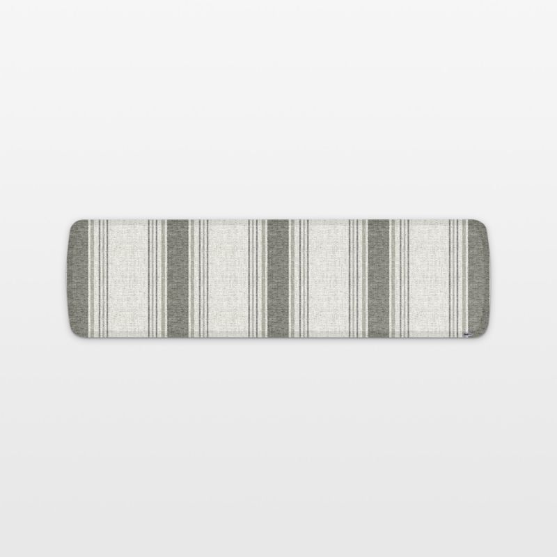 Finished with linen-like fabric striped in white and shades of grey, this elegant kitchen mat eliminates fatigue as you cook and clean. Thick and supportive, the mat layers gel and energy-return foam to help create cloud-like comfort and reduce pain as you chop vegetables, roll out cookies and wash dishes. Thanks to its curl-free beveled edges and non-slip bottom, the grey-striped kitchen mat helps create a safe workspace in the kitchen or laundry room—or paired with a standing desk. The stain- and water-resistant mat cleans up easily with a quick swipe of a soapy cloth.