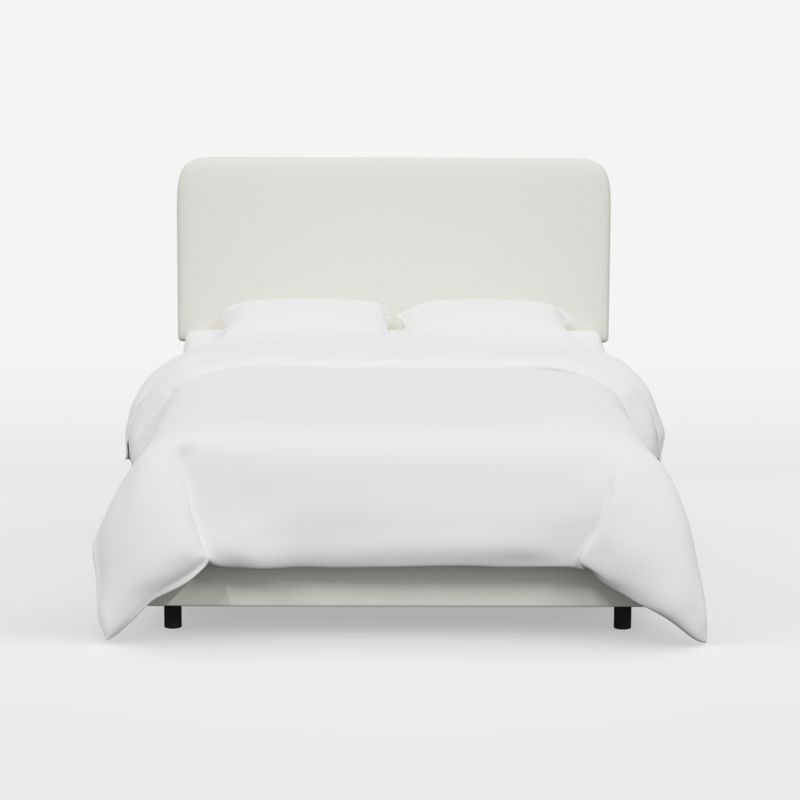 Strikingly simple Genevieve curves a tall, modern headboard with clean lines and rounded corners. Upholstered by hand, the made-to-order headboard provides an inviting spot to read and recline with soft cushioning wrapped in white linen-blend fabric. The snowy hue fits right into a neutral bedroom or serves as a serene backdrop for colorful, patterned bedding. Fitted with fully upholstered rails for a unified look and all-around softness, the Genevieve upholstered bed is the perfect centerpiece for a sleeping sanctuary.