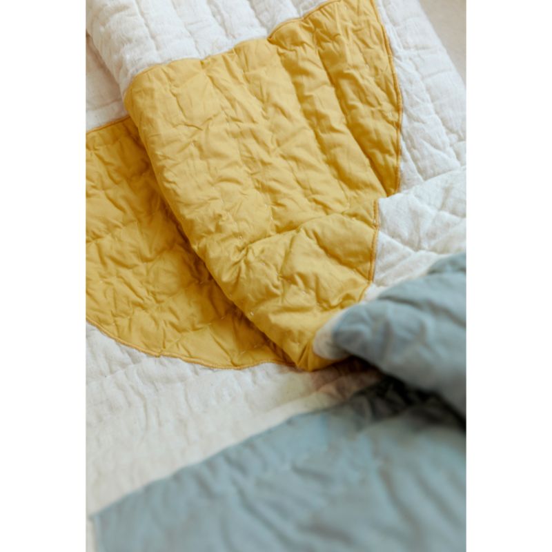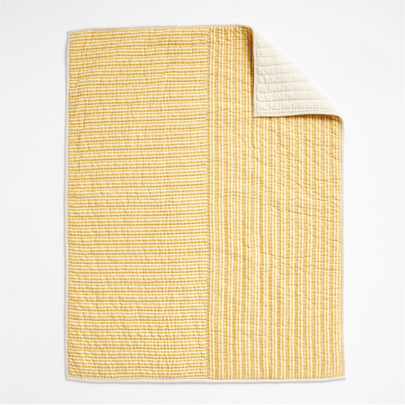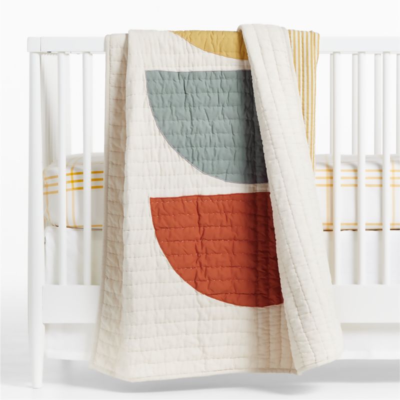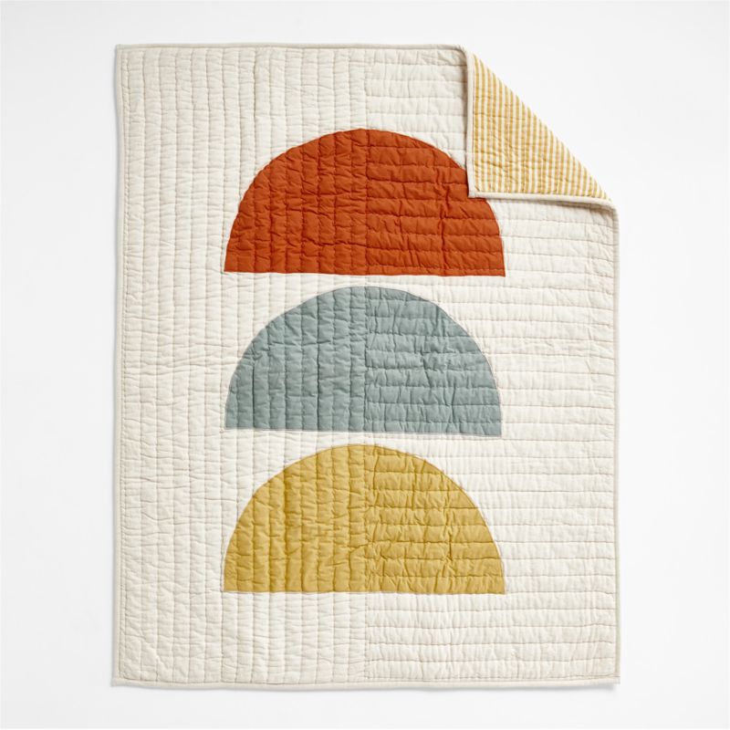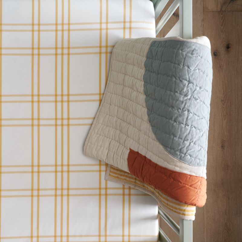 Happy colors, energizing patterns and hand stitched for tons of texture, our reversible crib quilt offers two times the style. On one side, three stacked half moons in orange, grey and yellow add modern contrast to the cream-colored background. Flip the quilt over to reveal a fun pop of narrow yellow and cream stripes. Sewn of cotton flex fabric, the quilt is undeniably soft and cozy, gentle on sensitive skin and lightly quilted for season-spanning warmth. Pair the crib quilt with the coordinating Geo-Dino crib fitted sheet printed with friendly dinosaurs in the same playful palette.