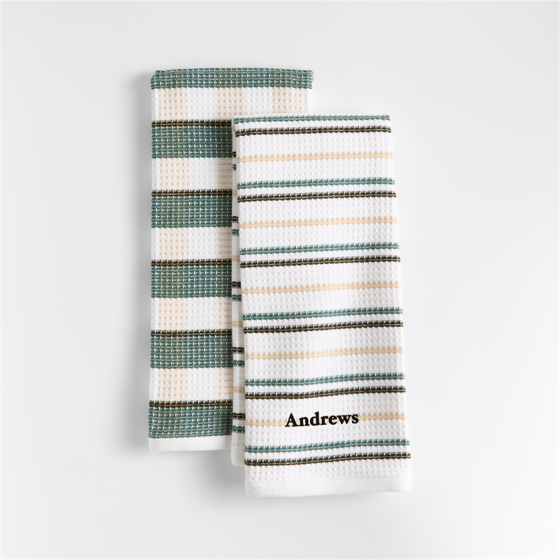 In stock and ready to ship Loading...Crate & BarrelSKU 613354Personalized Waffle-Terry Plaid & Stripe Pendula Green Organic Cotton Kitchen Towels, Set of 2Clearance $32.99 reg. $37.95includes $15 personalization feeFree Shipping Eligible0 of 1 purchasedAdd to Cart
