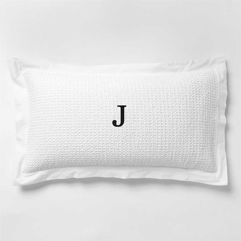 In stock and ready to ship Loading...Crate & BarrelSKU 343081Personalized Organic Cotton Waffle Crisp White King Bed Pillow Sham$65.95includes $16 personalization feeShips free0 of 2 purchasedAdd to Cart