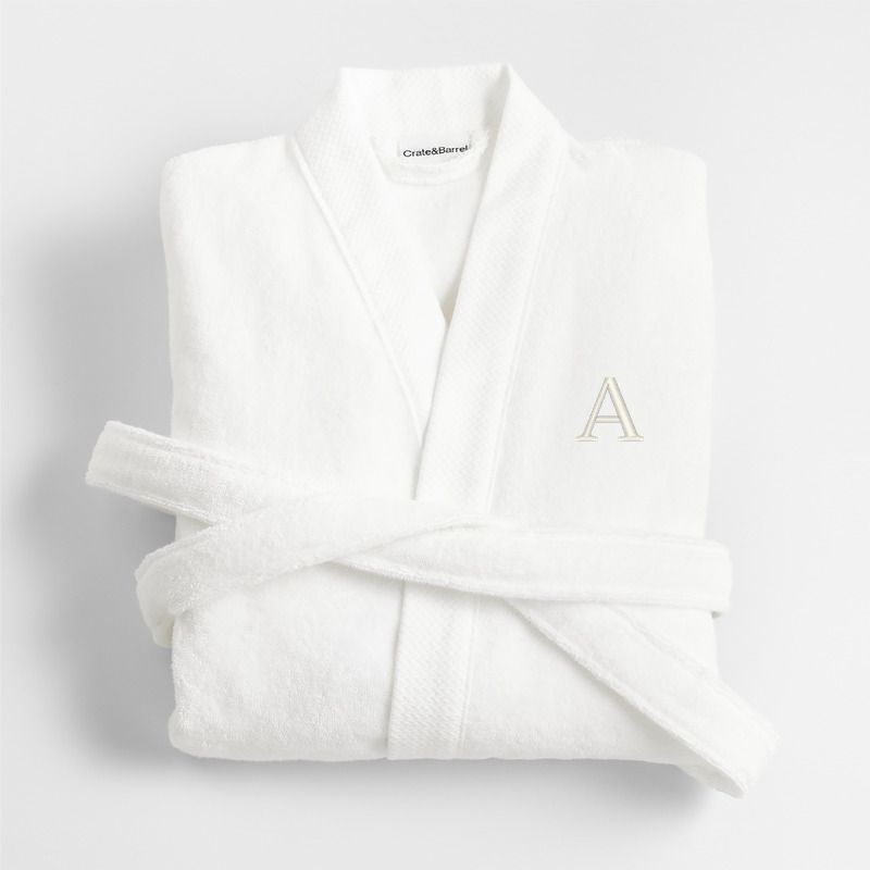 In stock and ready to ship Loading...Crate & BarrelSKU 569603Personalized Organic Turkish Cotton Crisp White Bath Robe S/M$114.95includes $15 personalization feeFree Shipping Eligible0 of 1 purchasedAdd to Cart