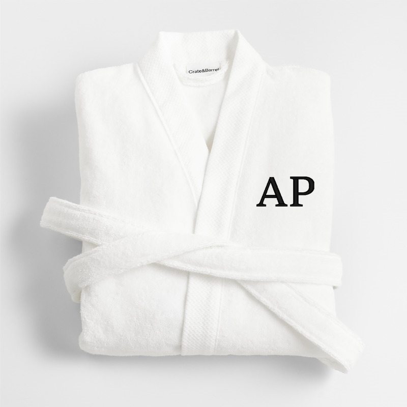 In stock and ready to ship Loading...Crate & BarrelSKU 569592Personalized Organic Turkish Cotton Crisp White Bath Robe L/XL$114.95includes $15 personalization feeFree Shipping Eligible0 of 1 purchasedAdd to Cart