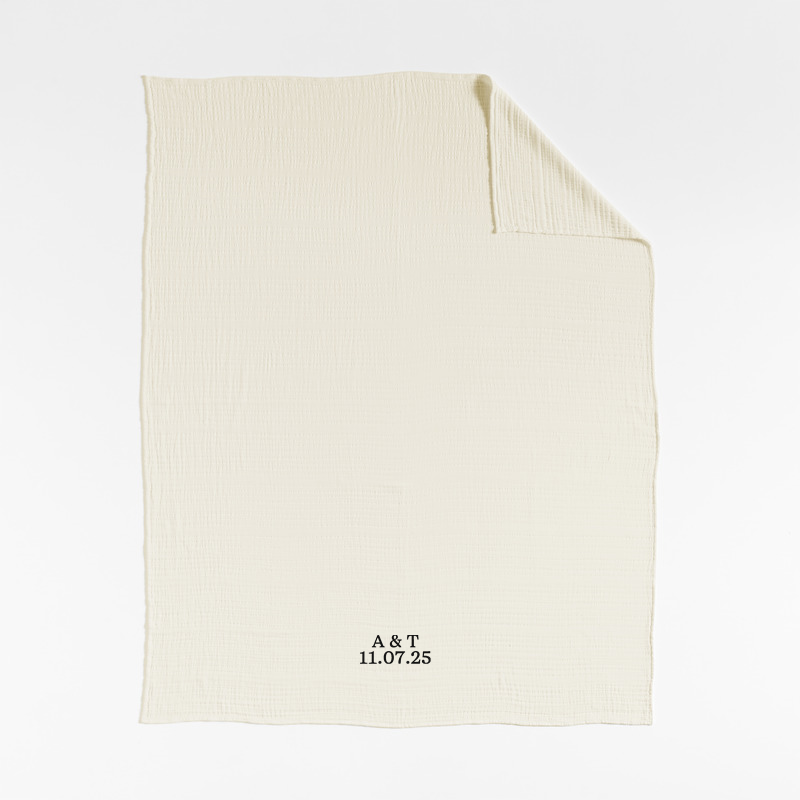 No longer available online. Loading...Crate & BarrelSKU 575503Personalized Solid Gauze 70"x55" Arctic Ivory Throw BlanketClearance $63.97 reg. $105.95includes $16 personalization feeShips free0 of 1 purchasedAdd to Cart