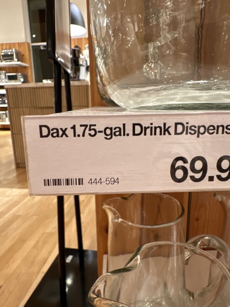In stock and ready to ship Loading...Crate & BarrelSKU 444594Dax 1.75-Gallon Drink Dispenser$99.95Free Shipping Eligible0 of 1 purchasedAdd to Cart