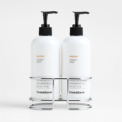 In stock and ready to ship Loading...Crate & BarrelSKU 620861Cedar + Sage Hand Soap and Lotion Set with Stainless Steel CaddySet Savings $39.95 open stock $44.85Free Shipping Eligible0 of 1 purchasedAdd to Cart