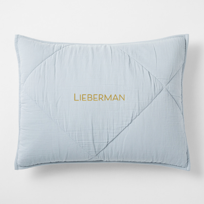 In stock and ready to ship Loading...Crate & KidsSKU 219314Personalized Supersoft Mist Blue Quilted Organic Cotton Gauze Kids Pillow Sham$54.95includes $15 personalization feeShips free0 of 1 purchasedAdd to Cart