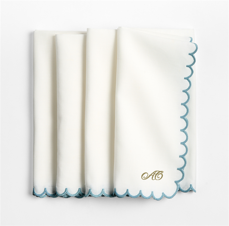 In stock and ready to ship Loading...Crate & BarrelSKU 447623Personalized Mini Scallop Napkins, Set of 4$74.95includes $15 personalization feeShips free0 of 2 purchasedAdd to Cart