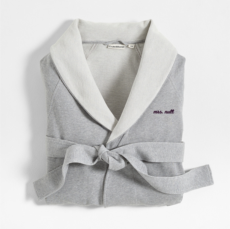 In stock and ready to ship Loading...Crate & BarrelSKU 359802Personalized Organic S/M Cotton Jersey Heathered Grey Bath Robe$159.95includes $15 personalization feeShips free0 of 1 purchasedAdd to Cart