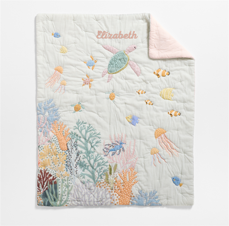 This item is in high demand and may take longer than usual to arrive. Estimated in mid June 2026.Loading...Crate & KidsSKU 391881Personalized Coral Reef Dreams 100% Organic Cotton Baby Crib Quilt$174.95includes $15 personalization feeShips free0 of 1 purchasedAdd to Cart