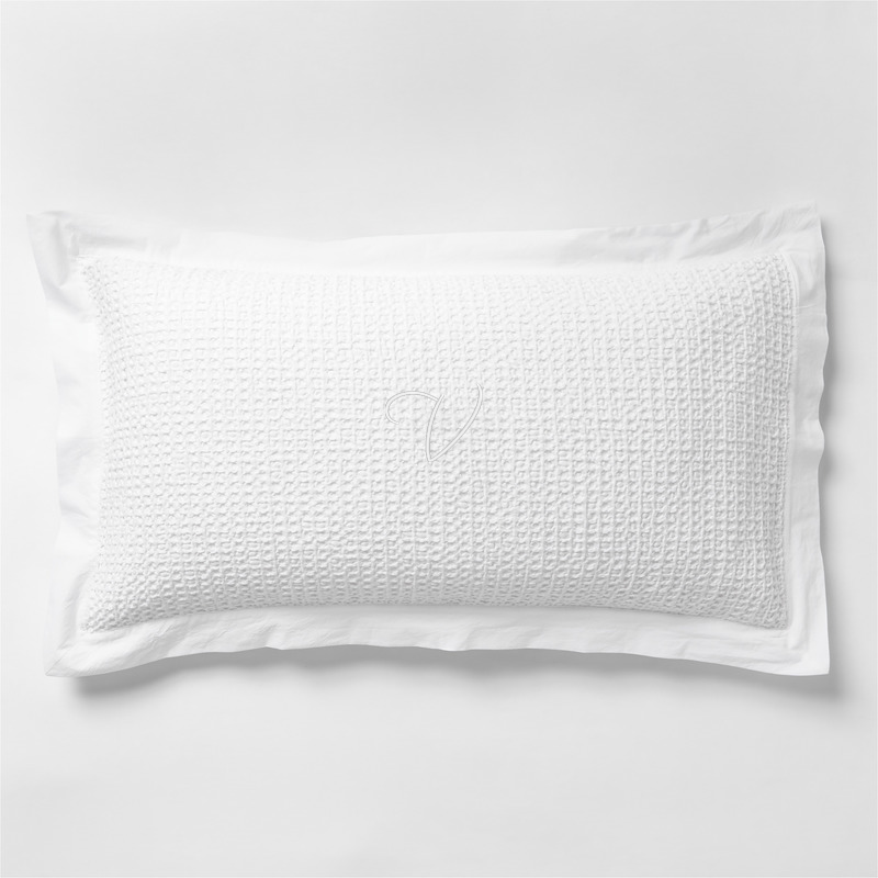 In stock and ready to ship Loading...Crate & BarrelSKU 343081Personalized Organic Cotton Waffle Crisp White King Bed Pillow Sham$69.95includes $15 personalization feeShips free0 of 2 purchasedAdd to Cart