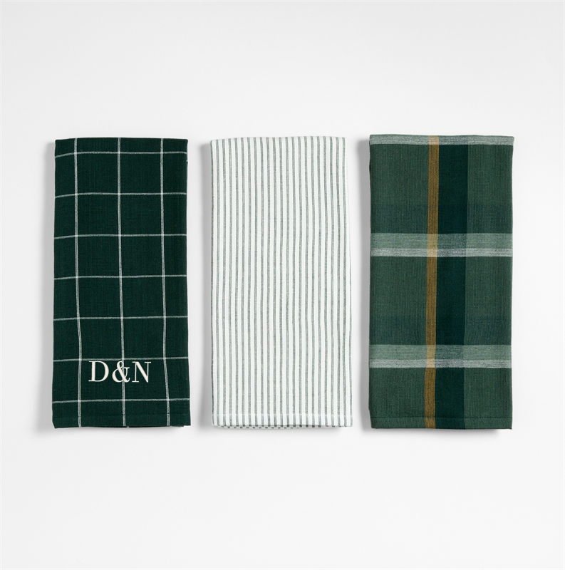 In stock and ready to ship Loading...Crate & BarrelSKU 251845Personalized Holiday Green Plaid and Stripe Organic Cotton Kitchen Towels, Set of 3$49.95includes $15 personalization feeFree Shipping Eligible0 of 1 purchasedAdd to Cart