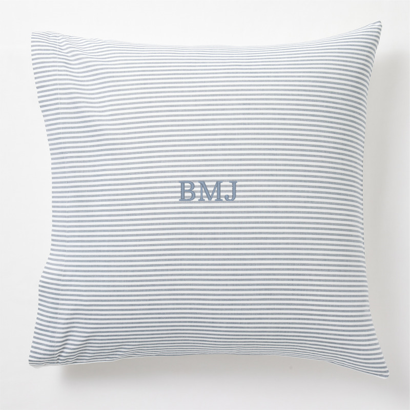 In stock and ready to ship Loading...Crate & BarrelSKU 585011Personalized Oxford Shirting Light Indigo Blue Organic Cotton Reversible Euro Bed Pillow Sham$79.95includes $15 personalization feeShips free0 of 1 purchasedAdd to Cart