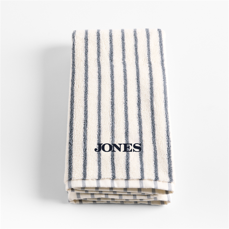 In stock and ready to ship Loading...Crate & BarrelSKU 627060Personalized Organic Turkish Cotton Pampas Ivory and Evening Blue Stripe Hand Towel$44.95includes $15 personalization feeShips free0 of 2 purchasedAdd to Cart