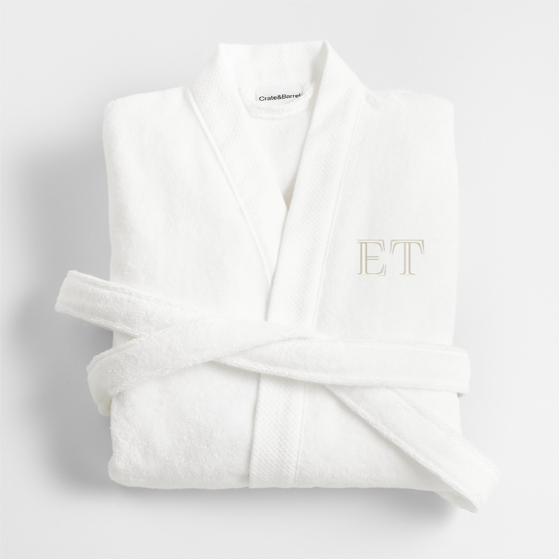 Purchase now and we'll ship when it's available. Estimated in mid April 2026.Loading...Crate & BarrelSKU 569592Personalized Organic Turkish Cotton Crisp White Bath Robe L/XL$114.95includes $15 personalization feeFree Shipping Eligible0 of 1 purchasedAdd to Cart