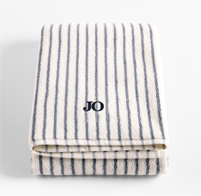 In stock and ready to ship Loading...Crate & BarrelSKU 626915Personalized Organic Turkish Cotton Pampas Ivory and Evening Blue Stripe Bath Sheet$79.95includes $15 personalization feeShips free0 of 1 purchasedAdd to Cart