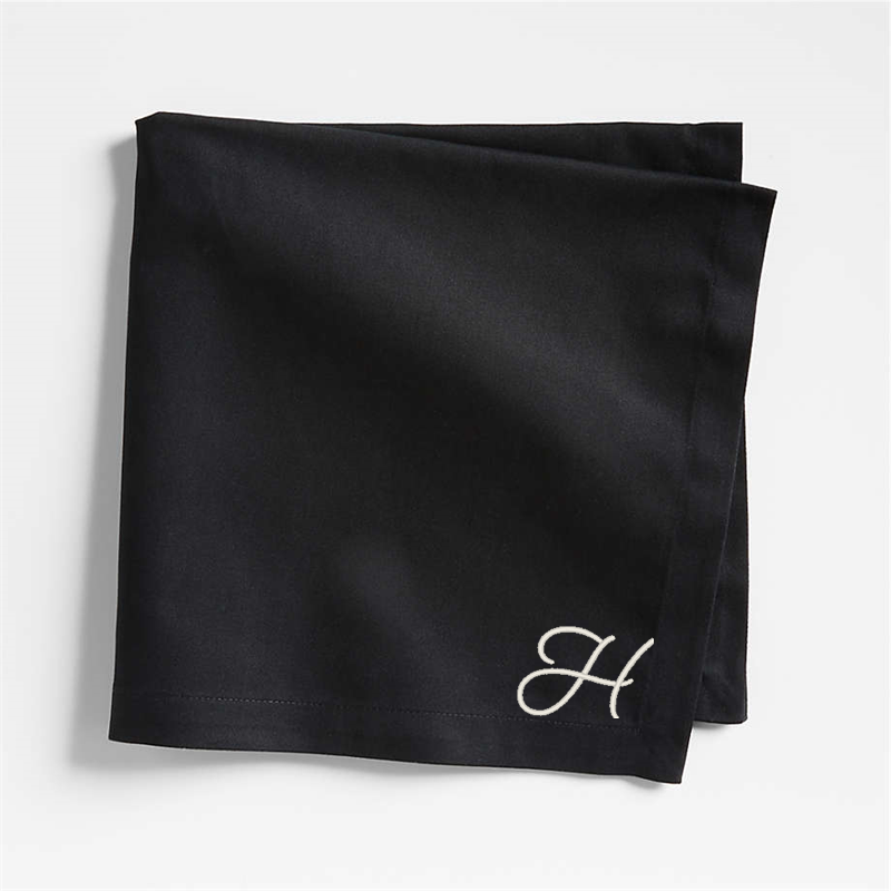 In stock and ready to ship Loading...Crate & BarrelSKU 228623Personalized Aspen Ink Black Organic Cotton Napkin$21.95includes $15 personalization feeShips free0 of 8 purchasedAdd to Cart