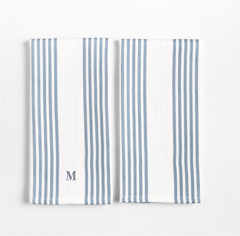 In stock and ready to ship Loading...Crate & BarrelSKU 427181Personalized Cuisine Harbor Blue with White Stripe Organic Cotton Kitchen Dish Towels, Set of 2$37.95includes $15 personalization feeFree Shipping Eligible0 of 1 purchasedAdd to Cart
