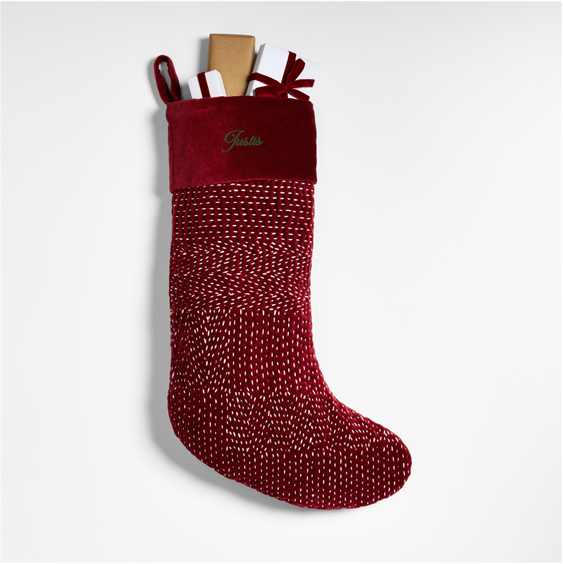 Purchase now and we'll ship when it's available. Estimated in early October 2025.Loading...Crate & BarrelSKU 239722Personalized Sashiko Red Velvet Christmas Stocking$59.95includes $15 personalization feeShips free0 of 1 purchasedAdd to Cart
