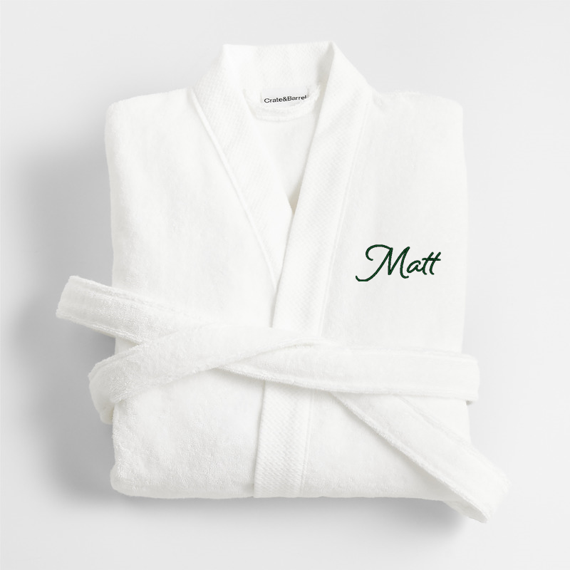 In stock and ready to ship Loading...Crate & BarrelSKU 569603Personalized Organic Turkish Cotton Crisp White Bath Robe S/M$114.95includes $15 personalization feeFree Shipping Eligible0 of 1 purchasedAdd to Cart