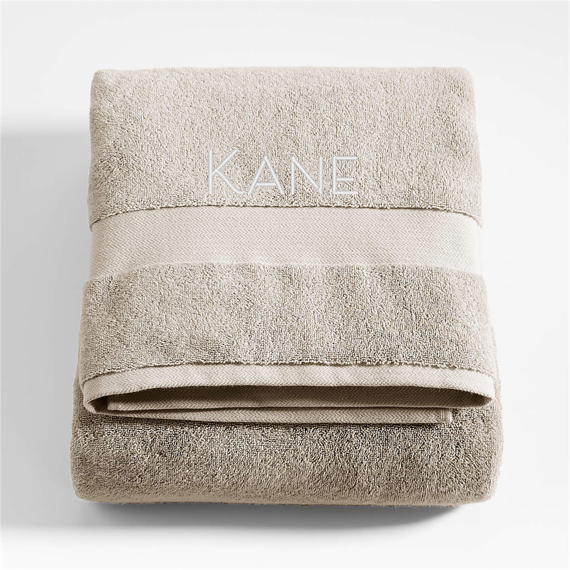 In stock and ready to ship Loading...Crate & BarrelSKU 218091Personalized Organic Turkish Cotton Taupe Bath Towel$49.95includes $15 personalization feeShips free0 of 8 purchasedAdd to Cart
