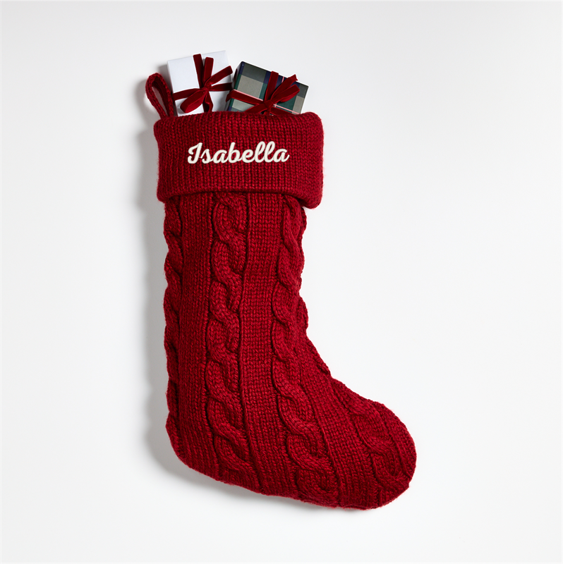 In stock and ready to ship Loading...Crate & BarrelSKU 237924Personalized Red Cable Knit Christmas Stocking$59.95includes $15 personalization feeFree Shipping Eligible0 of 1 purchasedAdd to Cart