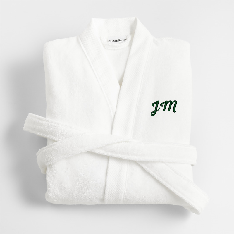 In stock and ready to ship Loading...Crate & BarrelSKU 569603Personalized Organic Turkish Cotton Crisp White Bath Robe S/M$114.95includes $15 personalization feeFree Shipping Eligible0 of 1 purchasedAdd to Cart