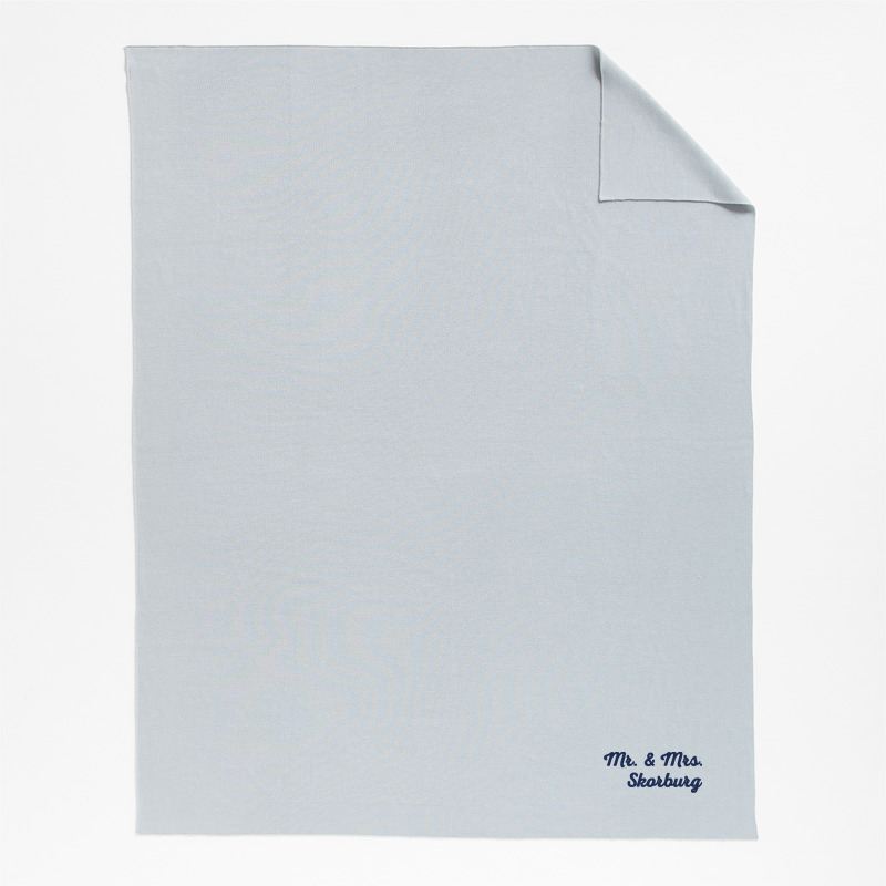 In stock and ready to ship Loading...Crate & BarrelSKU 235470Personalized Calda Chantilly 70"x55" Mist Blue Throw Blanket$114.95includes $15 personalization feeShips free0 of 1 purchasedAdd to Cart