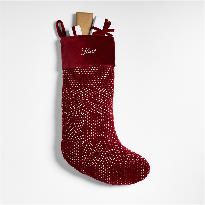 In stock and ready to ship Loading...Crate & BarrelSKU 239722Personalized Sashiko Red Velvet Christmas Stocking$59.95includes $15 personalization feeShips free0 of 1 purchasedAdd to Cart