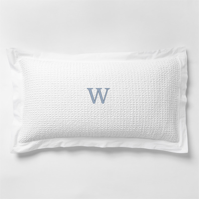 In stock and ready to ship Loading...Crate & BarrelSKU 343081Personalized Organic Cotton Waffle Crisp White King Bed Pillow Sham$69.95includes $15 personalization feeShips free1 of 2 purchasedAdd to Cart