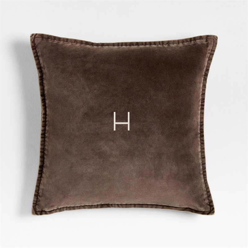 In stock and ready to ship Loading...Crate & BarrelSKU 499160Personalized Relaxed Washed Organic Cotton Velvet 20"x20" Deep Brown Throw Pillow with Down-Alternative Insert$86.95includes $15 personalization feeShips free0 of 2 purchasedAdd to Cart