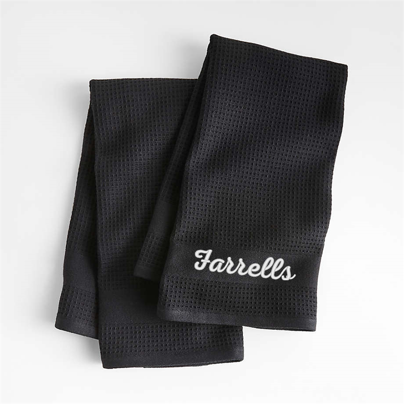 In stock and ready to ship Loading...Crate & BarrelSKU 493354Personalized Waffle-Terry Black Organic Cotton Kitchen Towels, Set of 2$37.95includes $15 personalization feeFree Shipping Eligible0 of 2 purchasedAdd to Cart