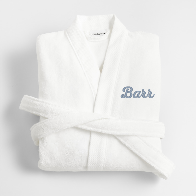 In stock and ready to ship Loading...Crate & BarrelSKU 569603Personalized Organic Turkish Cotton Crisp White Bath Robe S/M$114.95includes $15 personalization feeFree Shipping Eligible0 of 1 purchasedAdd to Cart