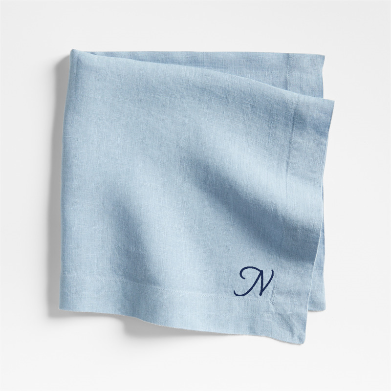 In stock and ready to ship Loading...Crate & BarrelSKU 544133Personalized Marin Light Blue EUROPEAN FLAX ™-Certified Linen Napkins, Set of 8$149.60includes $30 personalization feeShips free0 of 1 purchasedAdd to Cart