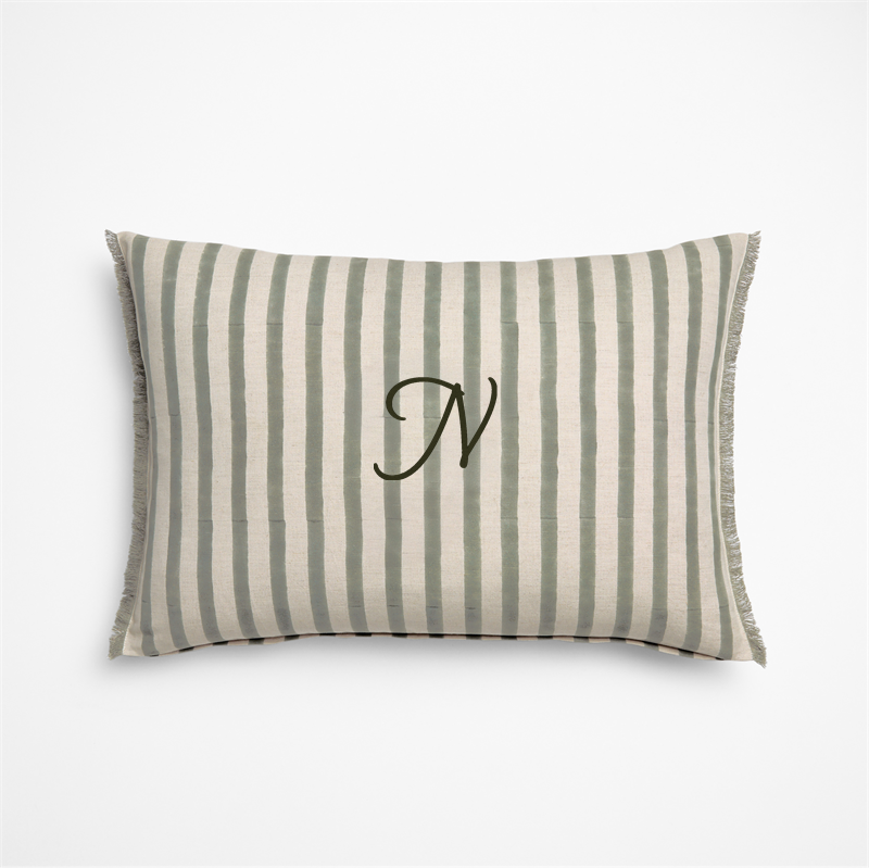 In stock and ready to ship Loading...Crate & BarrelSKU 437820Personalized Yarra Stripe Fringe 24"x16" Shadow Sage Green Throw Pillow CoverClearance $62.99 reg. $84.95includes $15 personalization feeShips free0 of 1 purchasedAdd to Cart