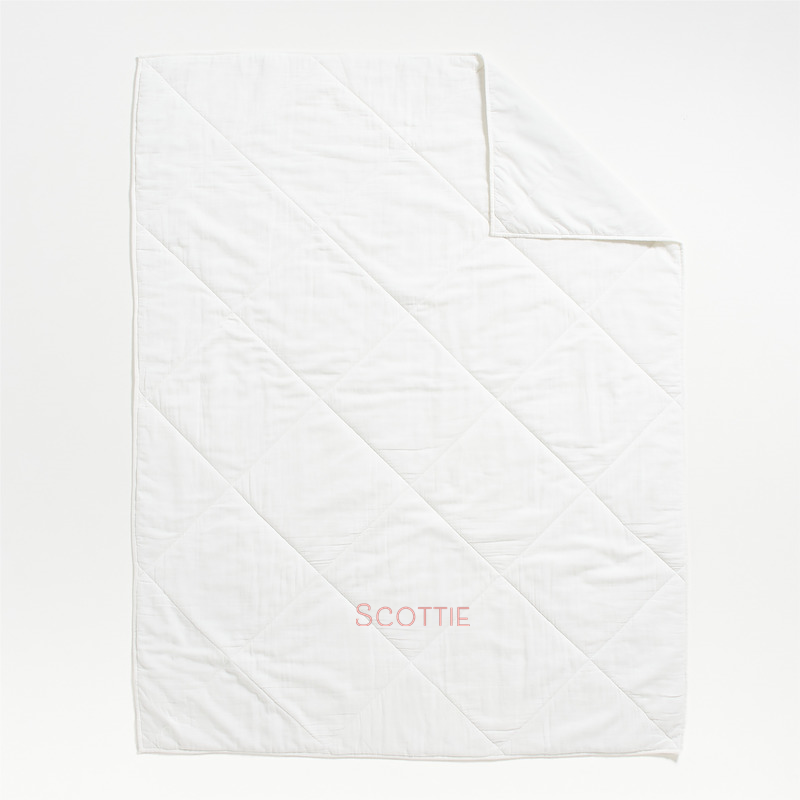 In stock and ready to ship Loading...Crate & KidsSKU 219179Personalized Supersoft Pampas Ivory Organic Cotton Gauze Kids Twin Quilt$190.95includes $15 personalization feeShips free0 of 1 purchasedAdd to Cart