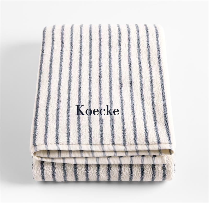 In stock and ready to ship Loading...Crate & BarrelSKU 626915Personalized Organic Turkish Cotton Pampas Ivory and Evening Blue Stripe Bath Sheet$79.95includes $15 personalization feeShips free0 of 2 purchasedAdd to Cart