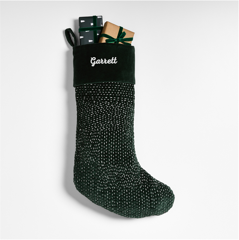 No longer available online. Loading...Crate & BarrelSKU 239691Personalized Sashiko Green Velvet Christmas StockingClearance $27.97 reg. $59.95includes $15 personalization feeFree Shipping Eligible0 of 1 purchasedAdd to Cart