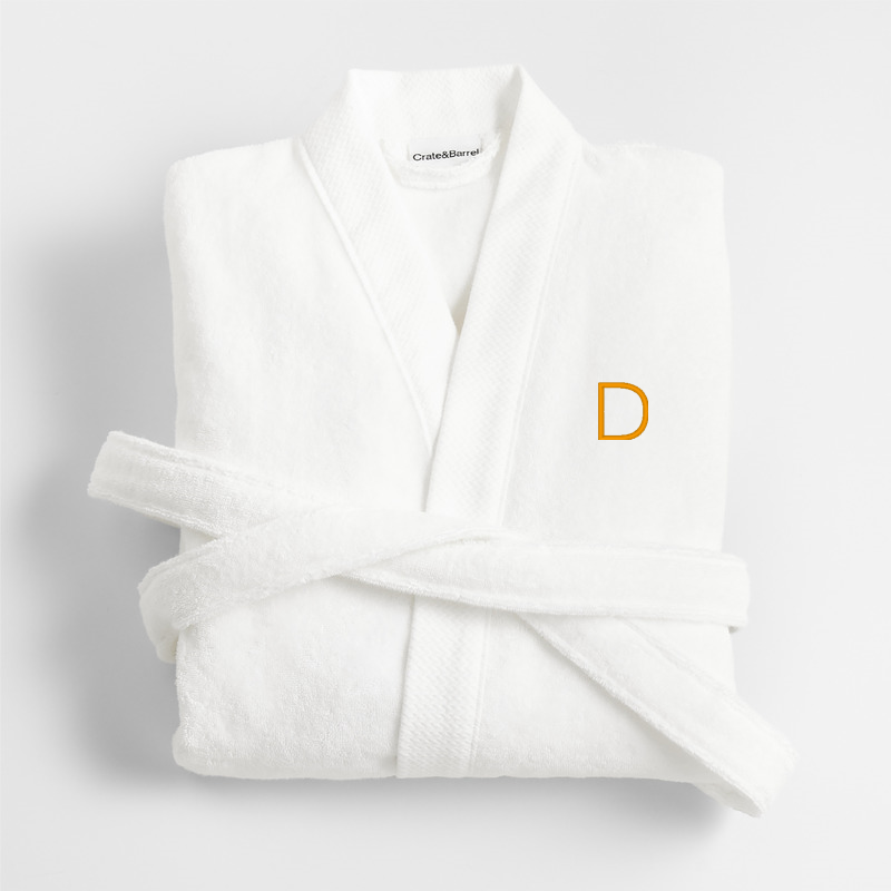 In stock and ready to ship Loading...Crate & BarrelSKU 569592Personalized Organic Turkish Cotton Crisp White Bath Robe L/XL$114.95includes $15 personalization feeFree Shipping Eligible0 of 1 purchasedAdd to Cart