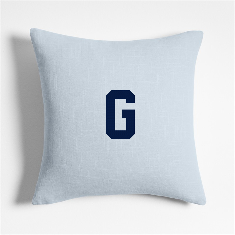 In stock and ready to ship Loading...Crate & BarrelSKU 655162Personalized Organic Cotton Monogrammable 20"x20" Sky Blue Throw Pillow with Down-Alternative InsertClearance $45.47 reg. $55.00includes $16 personalization feeShips free0 of 2 purchasedAdd to Cart