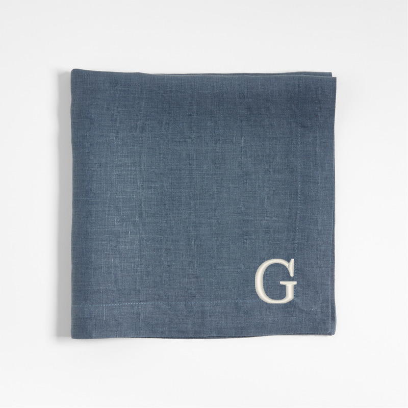 In stock and ready to ship Loading...Crate & BarrelSKU 374274Personalized Marin Slate Blue EUROPEAN FLAX ™-Certified Linen Napkins, Set of 4$74.80includes $15 personalization feeFree Shipping Eligible0 of 3 purchasedAdd to Cart