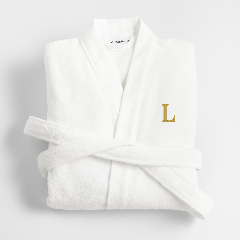 In stock and ready to ship Loading...Crate & BarrelSKU 569592Personalized Organic Turkish Cotton Crisp White Bath Robe L/XL$114.95includes $15 personalization feeFree Shipping Eligible0 of 1 purchasedAdd to Cart