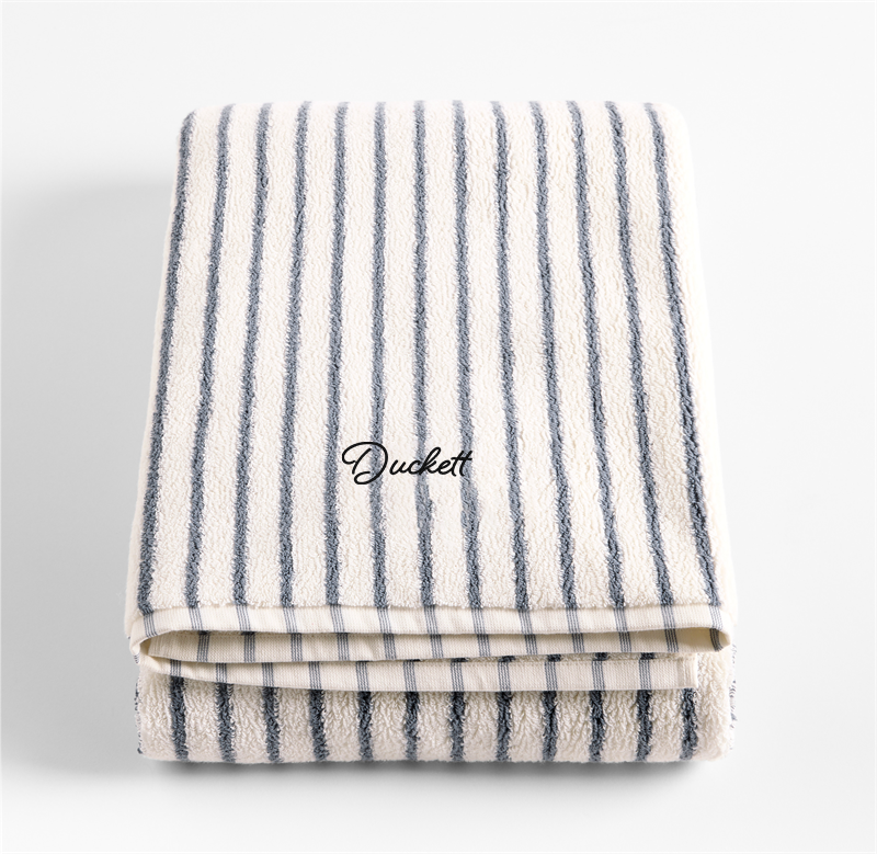 In stock and ready to ship Loading...Crate & BarrelSKU 626915Personalized Organic Turkish Cotton Pampas Ivory and Evening Blue Stripe Bath Sheet$79.95includes $15 personalization feeShips free0 of 1 purchasedAdd to Cart