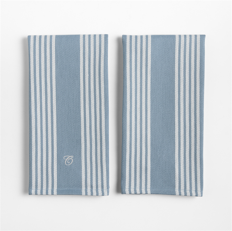 In stock and ready to ship Loading...Crate & BarrelSKU 427181Personalized Cuisine Harbor Blue with White Stripe Organic Cotton Kitchen Dish Towels, Set of 2$37.95includes $15 personalization feeFree Shipping Eligible0 of 2 purchasedAdd to Cart
