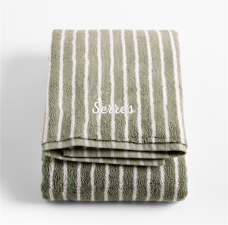 In stock and ready to ship Loading...Crate & BarrelSKU 626960Personalized Organic Turkish Cotton Shadow Sage and Pampas Ivory Stripe Bath Towel$59.95includes $15 personalization feeFinal Weekend! Free Ship Over $990 of 4 purchasedAdd to Cart