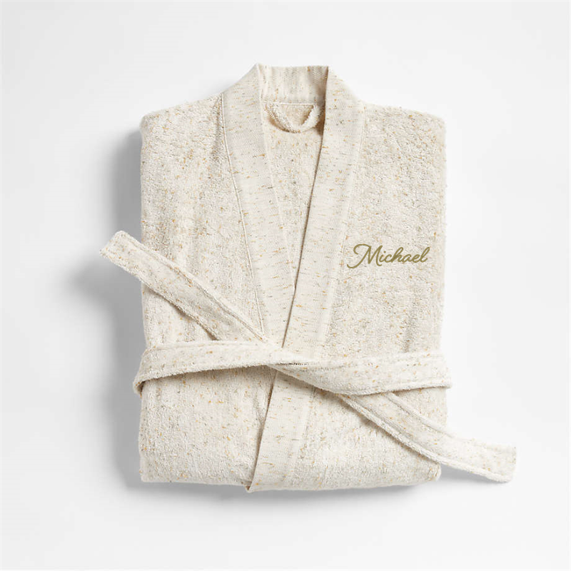 This item is in high demand and may take longer than usual to arrive. Estimated in mid July 2026.Loading...Crate & BarrelSKU 424220Personalized Organic Large/Extra-Large Turkish Natural Beige Fleck Bathrobe$134.95includes $15 personalization feeShips free0 of 1 purchasedAdd to Cart